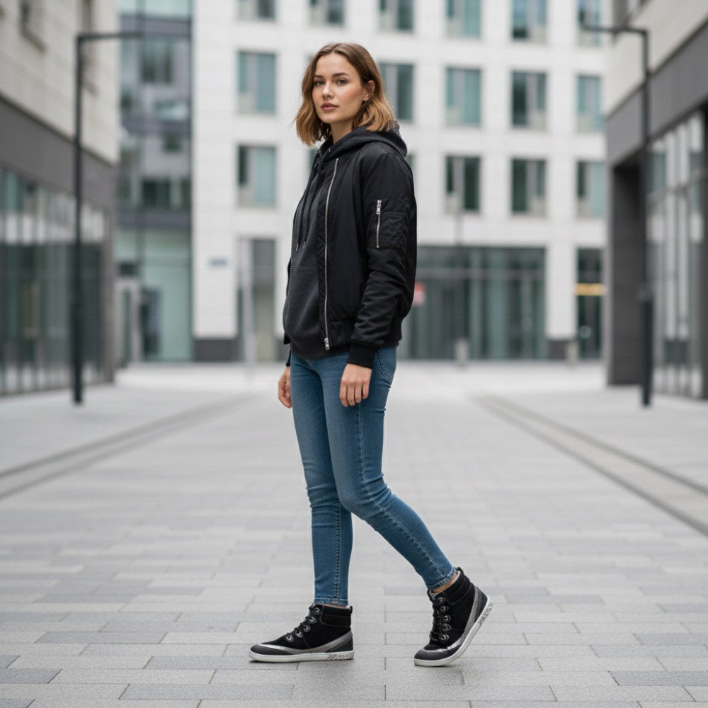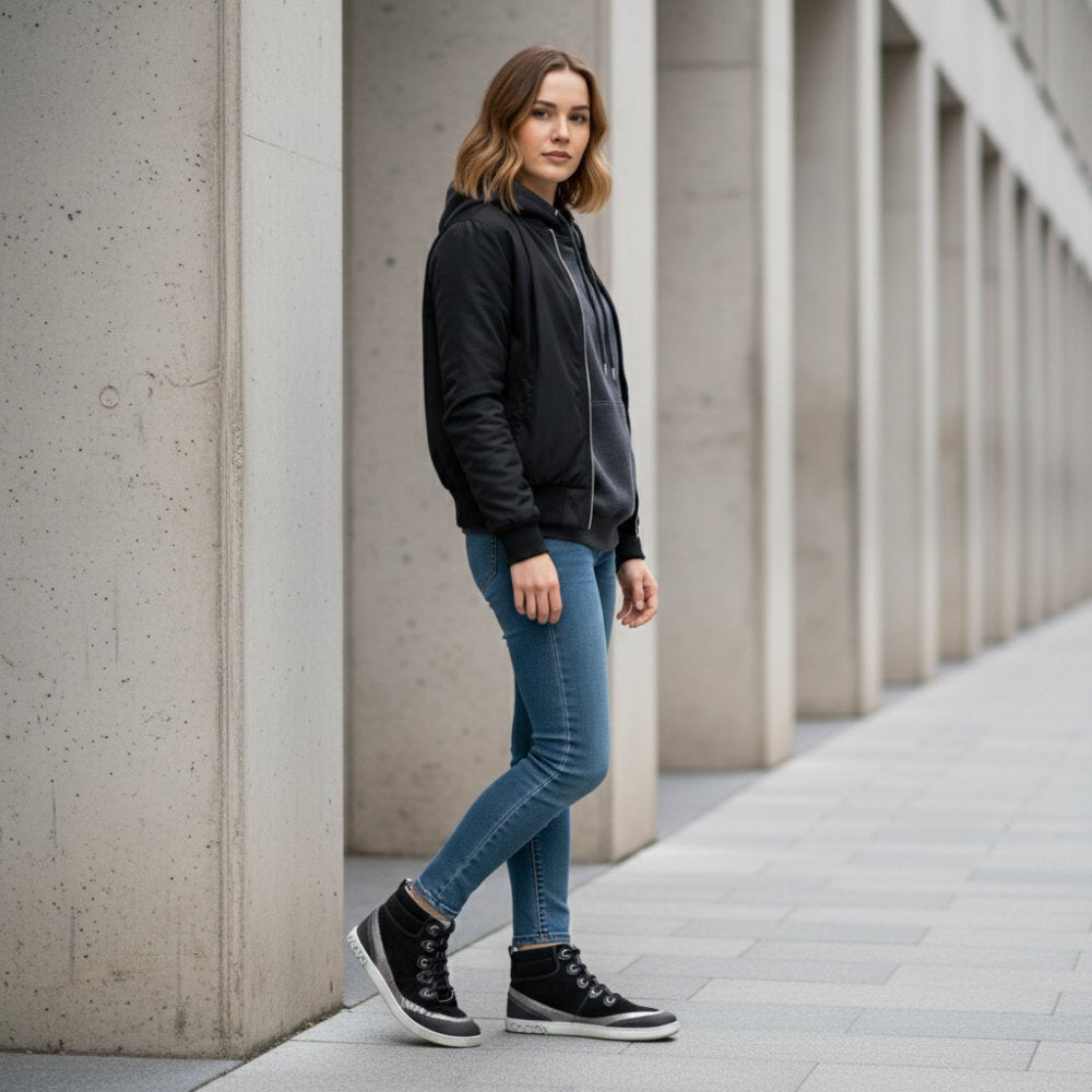 Für diesen halbhohen Sneaker verwenden wir weiches Veloursleder, welches wir mit silberfarbenen Nappaledereinsätzen kombiniert haben. Damit sieht unser CINQO schlicht aus und hat trotzdem eine extravagante Prise. Als weiteres Designelement haben wir in den besonders beanspruchten Bereichen dunkles Meshgewebe vernäht, welches besonders robust ist und dafür sorgt, dass der Barfußschuh extrem langlebig ist.