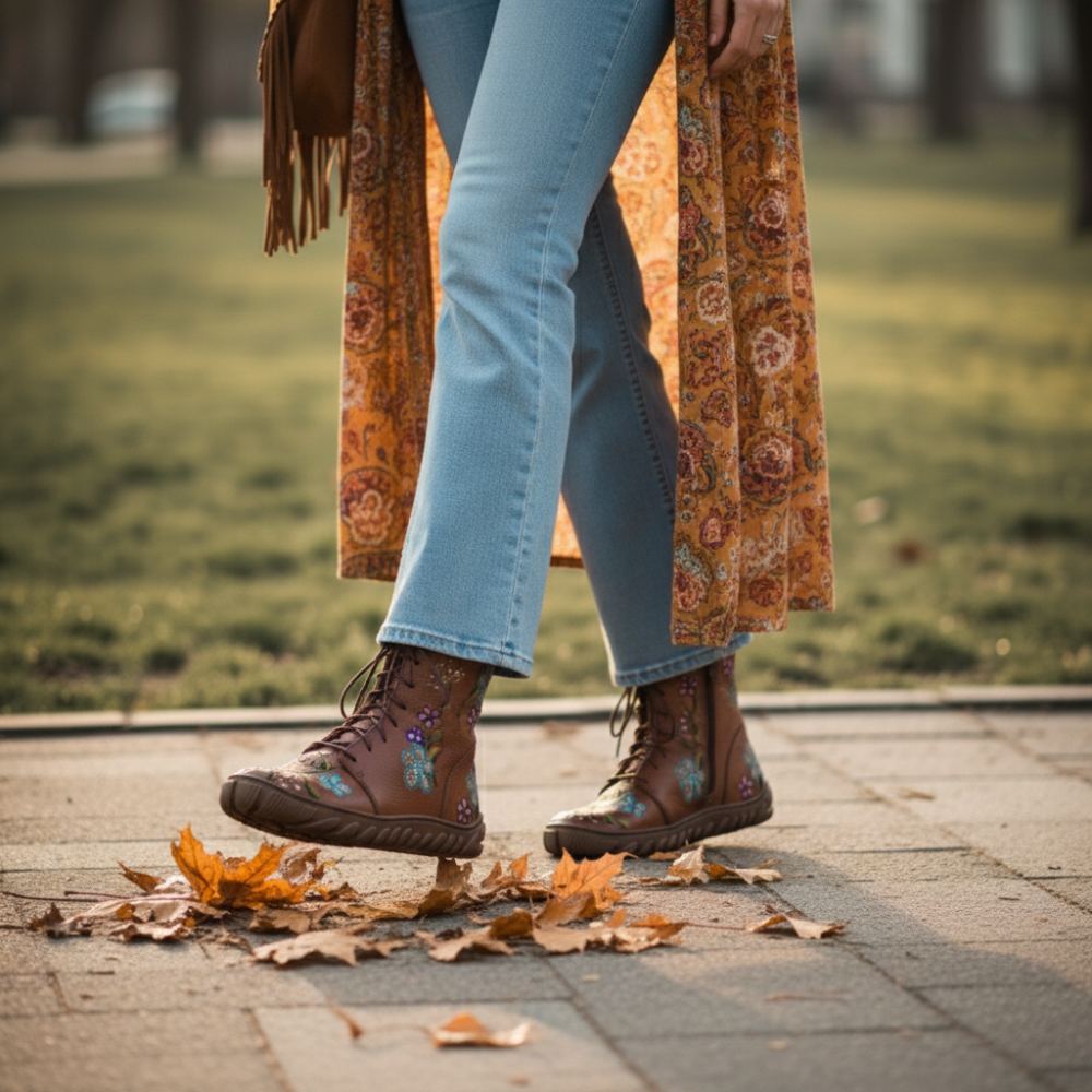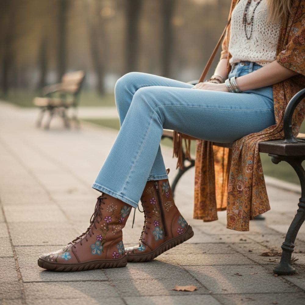 Diese Stiefel in einem warmen Braunton, verziert mit einem einzigartigen Flower Power Design, sind nicht nur ein optisches Highlight, sondern auch ein Symbol für Freiheit und Natürlichkeit. Das Premium Nappaleder sorgt für eine hochwertige Optik, während der Reißverschluss am Innenschaft und die Schnürung eine individuelle Passform und leichtes Anziehen ermöglichen.