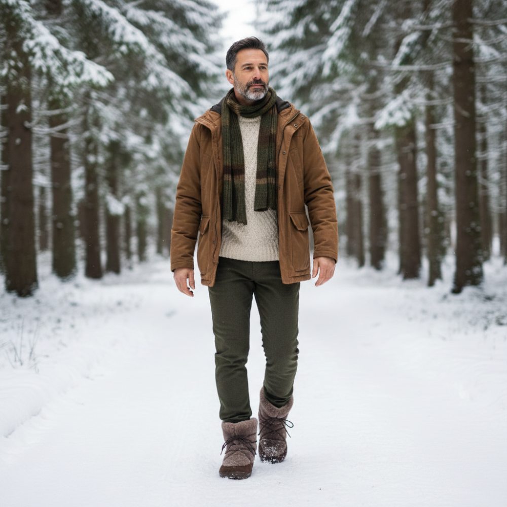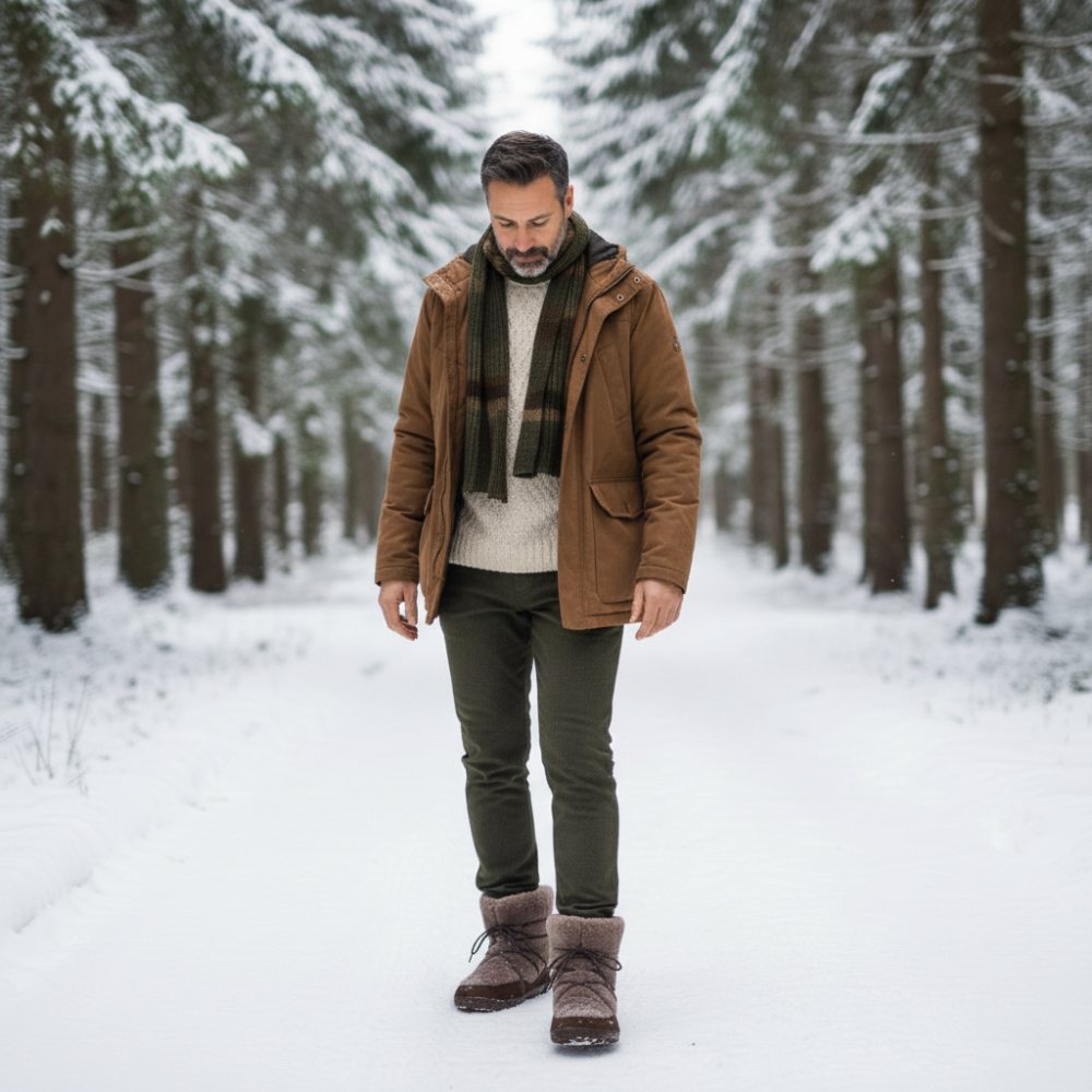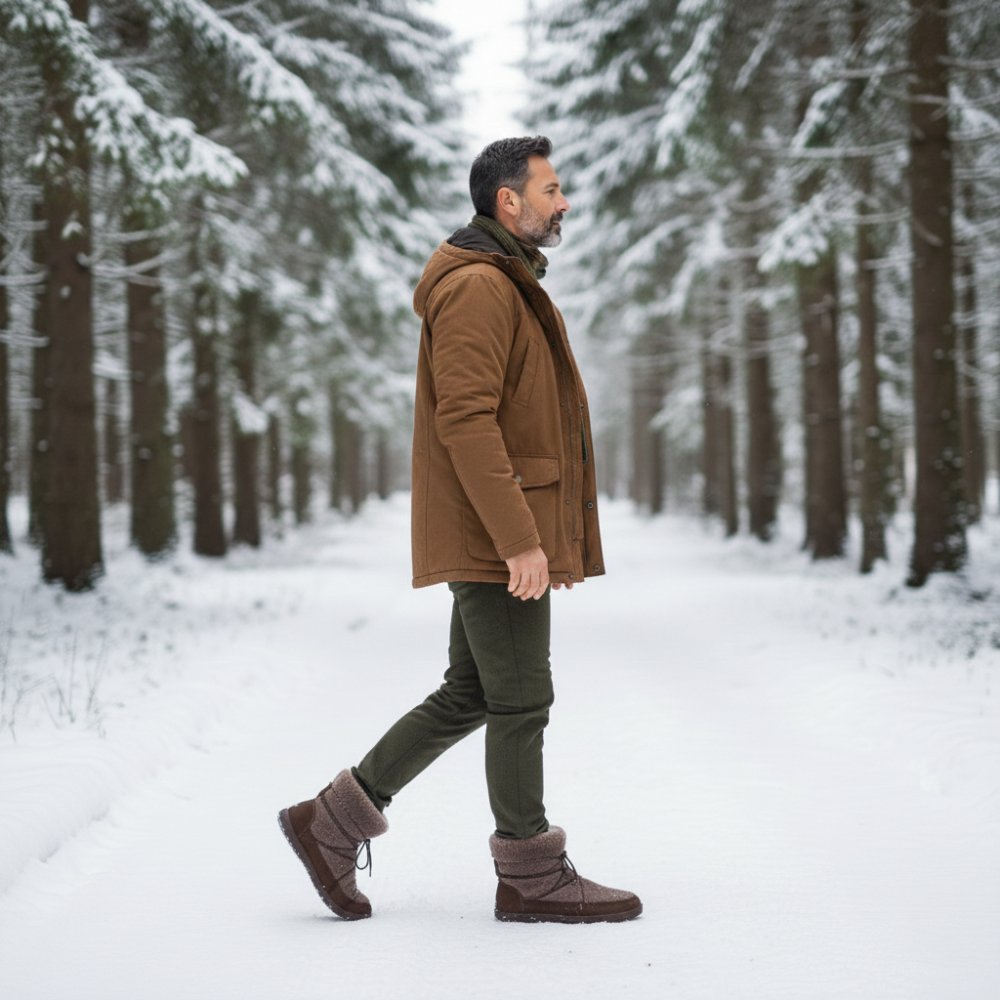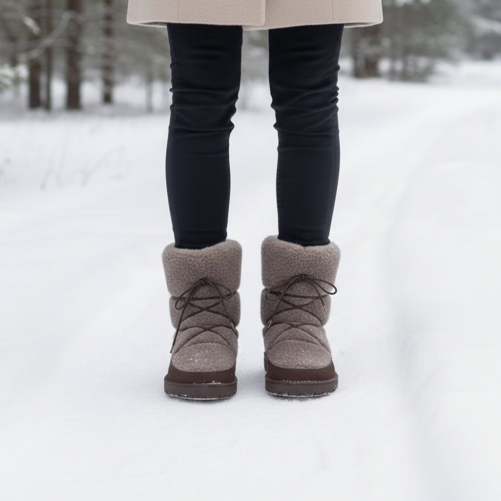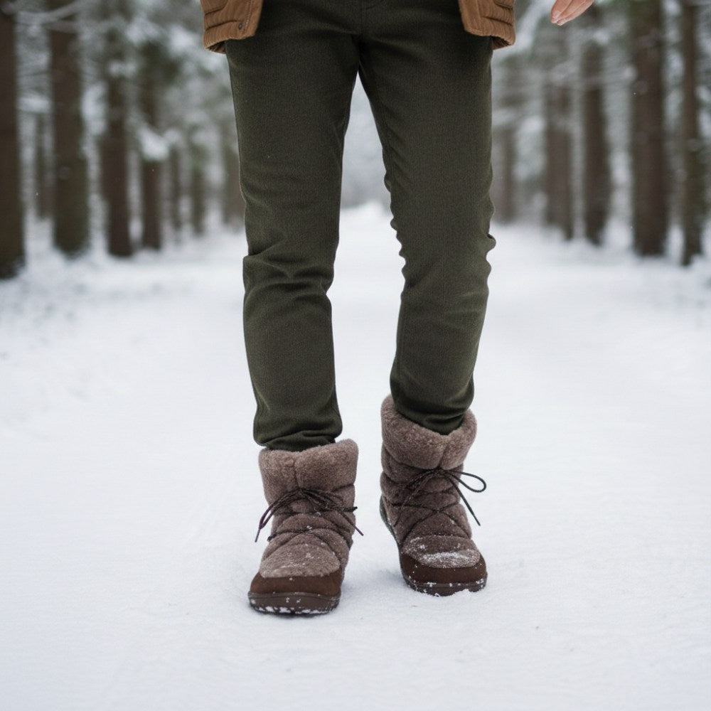 In dem unteren Bereich haben wir hochwertiges Nubukleder per Hand an die Barfußsohle gestrobelt. Damit ist der Winterstiefel äußerst robust, stabil und langlebig. Im oberen Bereich besteht unser HYGGELIQ aus kuscheligem Lammfell. Dadurch bekommt der Barfußstiefel seinen unvergleichlichen Look. Am liebsten würdest Du ihn gleich streicheln, oder? Über die Schnürsenkel, die sich dezent im hohen Lammfell verstecken, kannst Du den halbhohen Stiefel enger schnüren oder bei Bedarf weiten. So sitzt er immer perfekt an Deinem Fuß. Kalte Füße gehören der Vergangenheit an, mit HYGGELIQ bist Du von der Sohle bis zur Wade kuschelig warm verpackt.