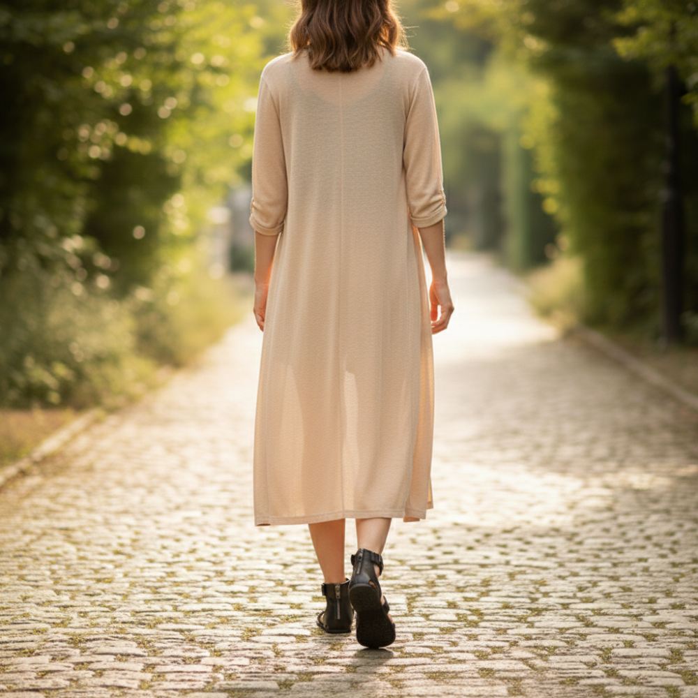 Kautschuksohle mit Nullabsatz, dadurch Entlastung der Wirbelsäule und Schonung der Gelenke, unterstützt die natürliche Körperhaltung
