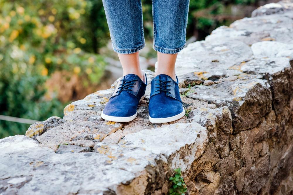 Das Obermaterial besteht aus hochwertigem Veloursleder, welches im Schnür- und Fersenbereich mit Nappaleder abgesetzt ist. Ton in Ton gehalten, greifen auch die Schnürsenkel den dunkelblauen Farbton auf. Mit dem Innenfutter aus anschmiegsamen, weißen Glattleder und der weißen Sohle erzeugen wir einen tollen Kontrast, wodurch der Barfußschuh leicht und modern wirkt.