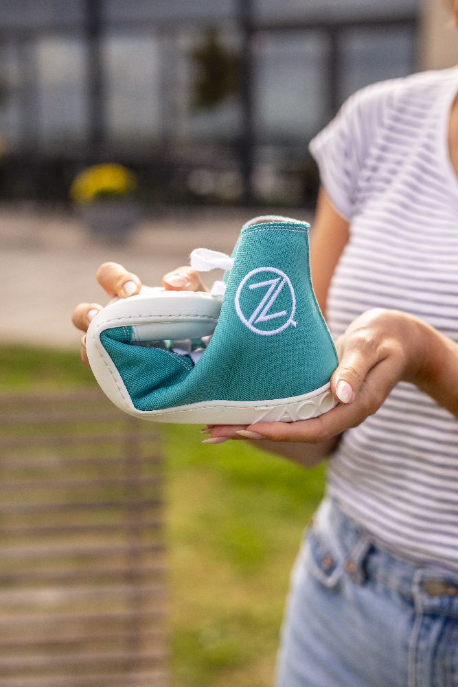 Realizzato in denim blu turchese, non solo offri un design fresco e sorprendente, ma anche tutti i vantaggi di una scarpa a piedi nudi. Con il berretto bianco e i lacci delle lacci bianchi, sembrano sportivi e allo stesso tempo moderni.