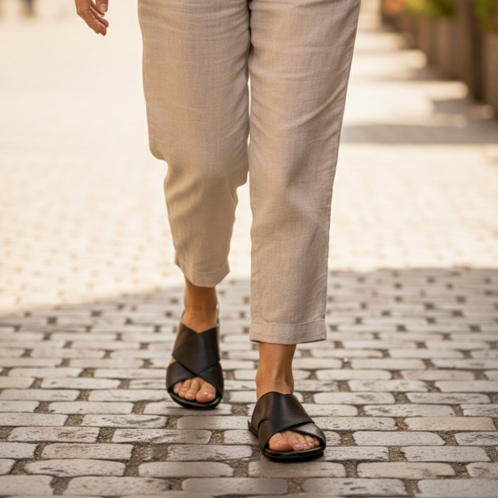 Con due cinturini in pelle incrociati che offrono la migliore fermata, puoi semplicemente scivolare nei sandali neri Manqa e goderti il giorno al massimo. Niente fibbie, niente fronzoli - solo puro comfort e libertà per i tuoi piedi. Questi sandali combinano la leggerezza di una scarpa a piedi nudi con l'eleganza di un accessorio alla moda.