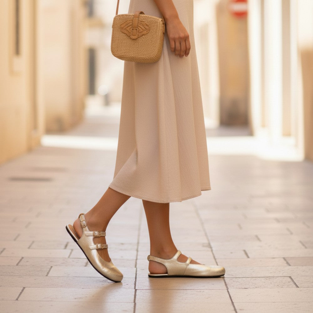 Il nostro Qomeet Gold combina glamour e comfort in una scarpa da ballerina tagliata apertamente. Con le cinghie regolabili sopra il morsetto e il cinturino aggiuntivo sul retro, il nostro Gomeet Gold offre una vestibilità perfetta e una presa sicura ad ogni passo.
