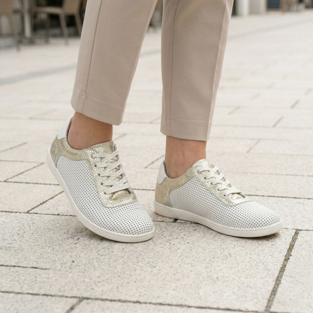 Questa sneaker a piedi nudi affascina anche con un design sorprendente: la pelle Nappa bianca e perfettamente perforata garantisce la permeabilità all'aria e i dettagli in oro sull'albero e l'allacciatura forniscono quel certo qualcosa!